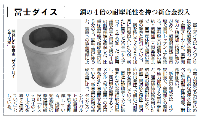 3月19日付「日刊工業新聞」紙面「南東京特集」の「キラリと光る我が社のイチ押し製品・サービス」に、当社が開発した新合金【サステロイ STN30】に関する記事が掲載されました。